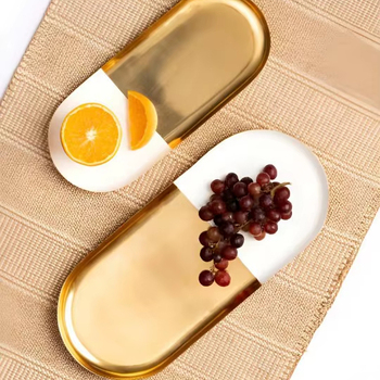 ถาดเสิร์ฟโลหะสีทองแบบยาวเรียบง่ายเหมาะสำหรับงานพิเศษใช้ในชีวิตประจำวันและการตกแต่งบ้านที่หรูหราขายส่งจากอินเดีย